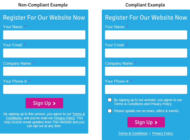 New rights of the Data Subject (anyone providing identifying personal data i.e. customers, employees or users) must actively opt into marketing activities. This basically leads to elimination of blanket or bundled consent, consent by default, consent below the fold, consent as a condition of sale, service, or general Ts & Cs and even the pre-ticked checkboxes, complex legalese and confusing double negatives.